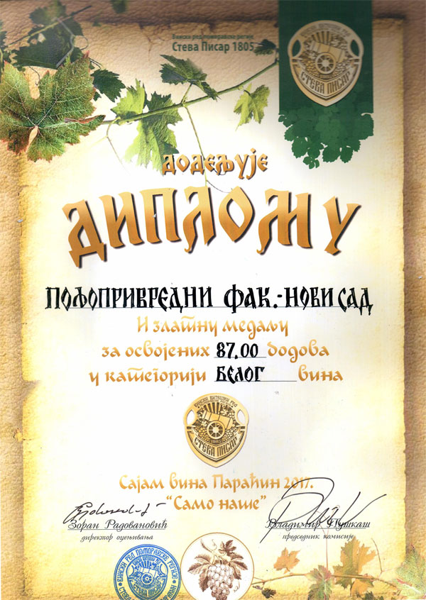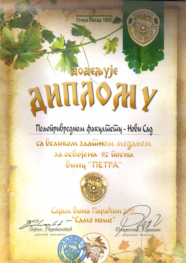 Пољопривредни факултет Универзитета у Новом Саду награђен је са две златне медаље на такмичењу организованом у оквиру Сајма вина у Параћину 10. и 11. марта 2017. године.